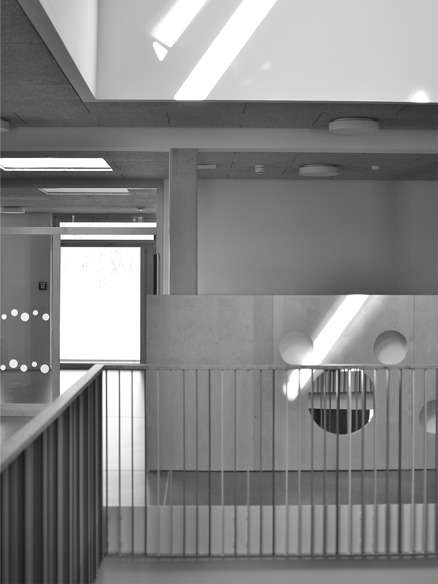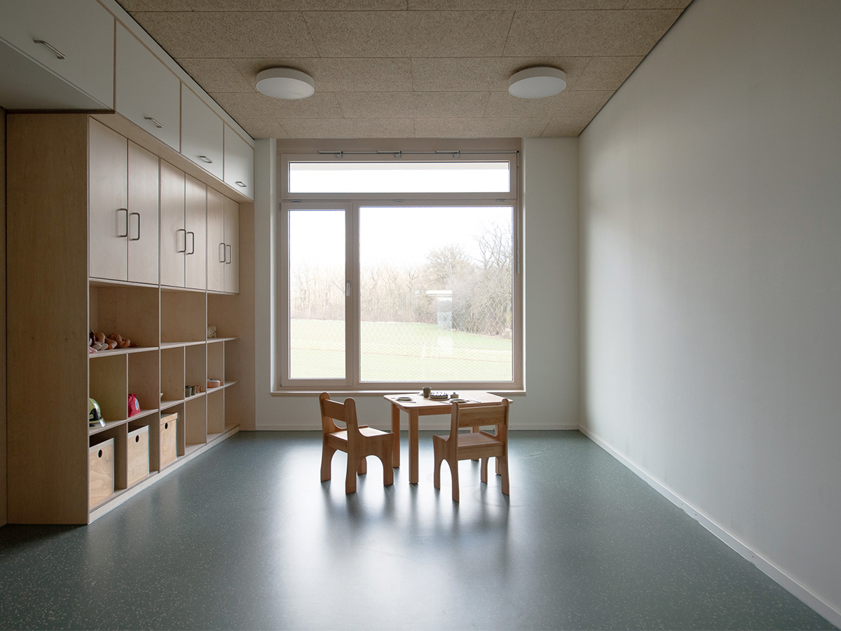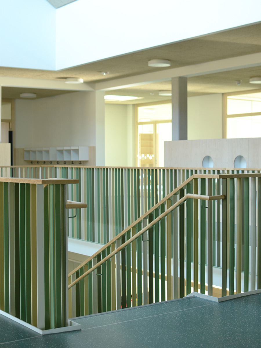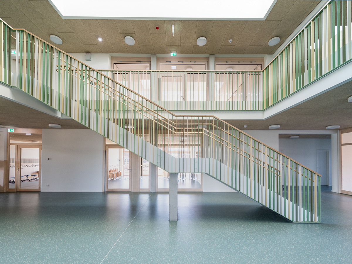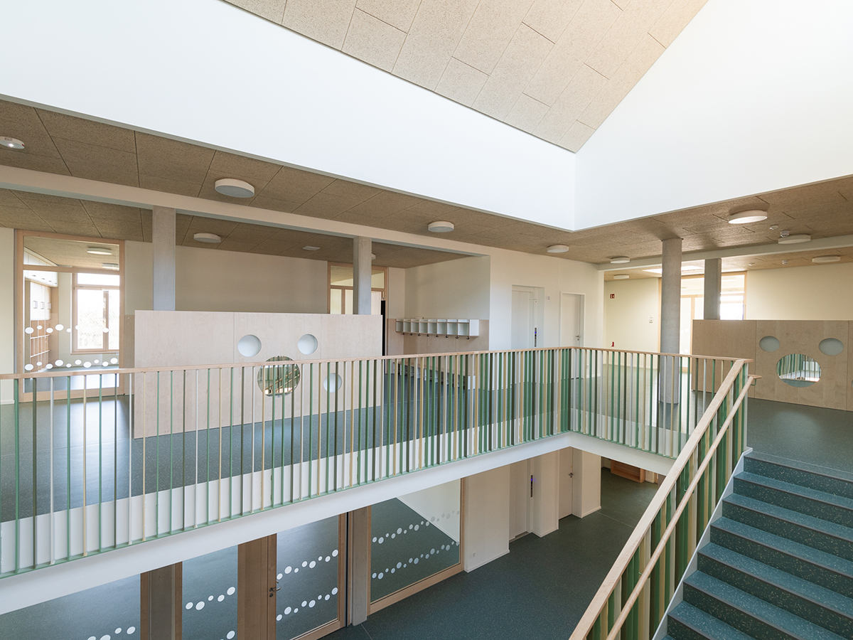 Über den Vorplatz gelangt man durch einen großzügigen und überdachten Eingangsbereich in die zentrale Halle der Kita. Sie bildet das Herz des Kinderhauses und schafft Orientierung und Übersichtlichkeit. Dieser zentrale „Markplatz“ wird über ein Oberlicht und die Loggia natürlich belüftet und belichtet und verbindet die unterschiedlichen Nutzungsbereiche im Kinderhaus mit Sichtbezügen über beide Ebenen. Das freistehende Treppenmöbel im Zentrum der Halle nimmt die Topographie der Umgebung auf und schafft Bewegungsangebote für die Kinder und Wartebereiche für die Eltern. Die U3-Gruppe befindet sich in geschützter Lage im südlichen Teil des Erdgeschosses. Die Garderobenbereiche der einzelnen Gruppen schaffen kleine Vorplätze und bilden die Adresse der jeweiligen Gruppe.