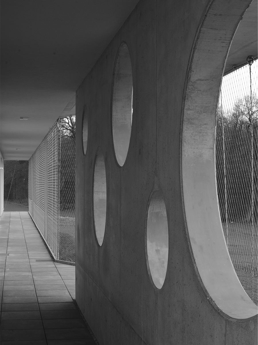 Die Stahlbetondecken des monolithischen Mauerwerksbaus zeichnen sich in der Fassade in Form einer umlaufenden Loggia nach außen ab. Diese verbindet die Themen Brandschutz, konstruktiver Sonnenschutz, Absturzsicherung sowie Fassadengestaltung. Die äußere Filterschicht wird durch ein transparentes Edelstahlnetz begrenzt und schafft einen Zwischenraum zwischen Außen und Innen. Sie umfasst die beiden außenliegen Treppen als direkter Zugang zum Außenspielbereich und ermöglicht zudem in Teilbereichen eine vertikale Begrünung der Hülle.