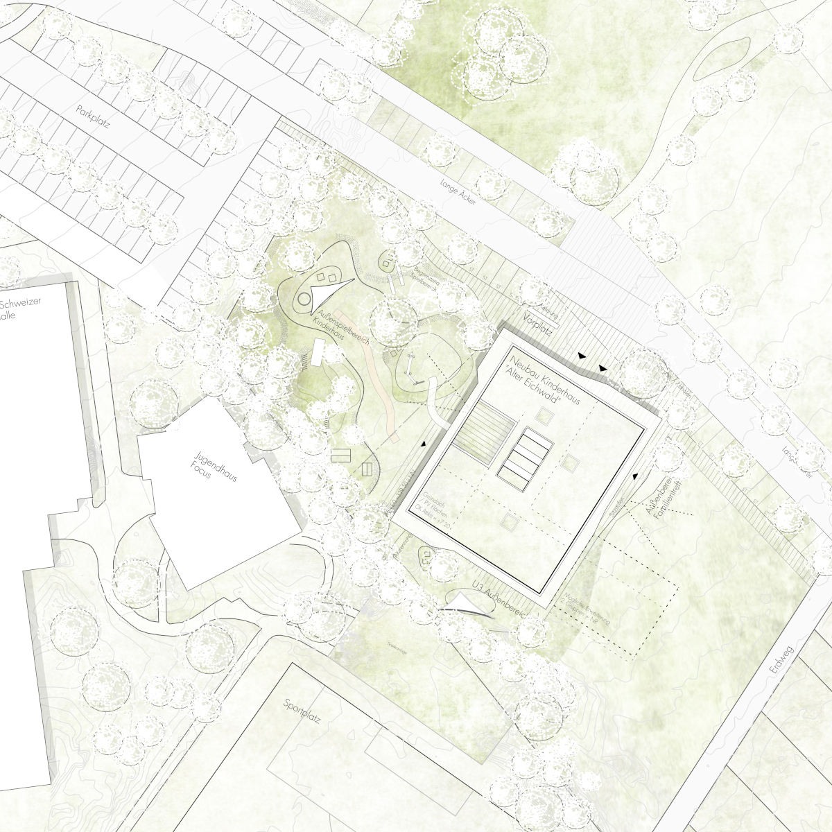Das Kinderhaus „Alter Eichwald“ gliedert die angrenzenden Außenräume in vier differenzierte Bereiche. Im Nordosten wird ein Vorplatz definiert, welcher ein sicheres Ankommen ermöglicht und das Kinderhaus in das geplante Wegenetz einbindet. Im Südosten gliedert sich der Vorbereich des Familienzentrums mit landschaftlichen Sitzstufen an, im Südwesten entsteht ein übersichtlicher, geschützter Außenspielbereich für die U3- Gruppe, welcher getrennt vom großzügigen Spielgarten der größeren Kinder auf der Fläche des geplanten Grünzugs funktioniert.