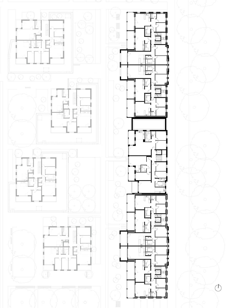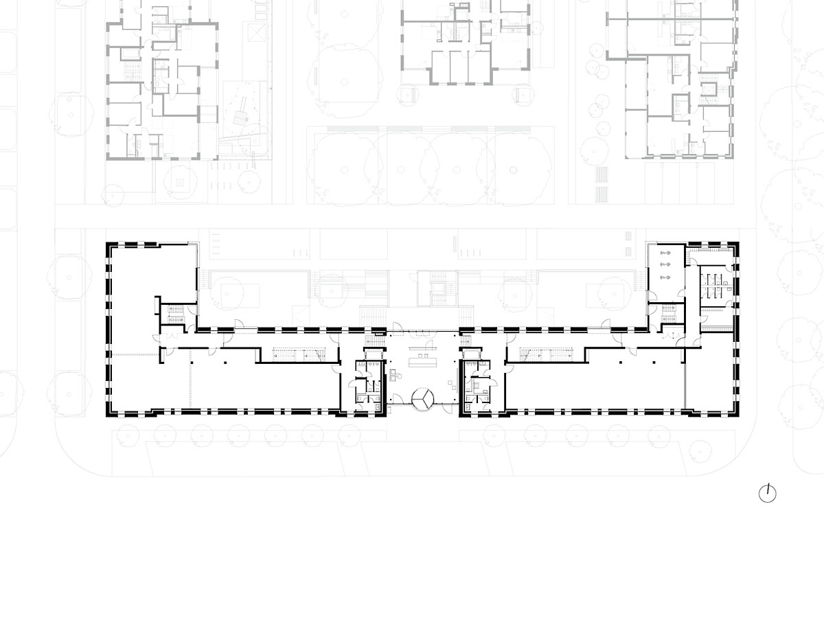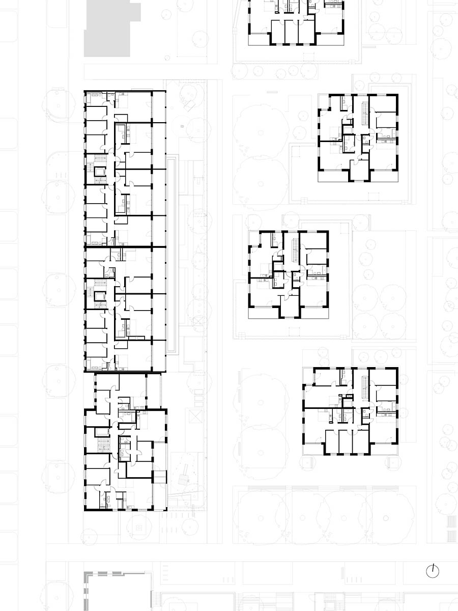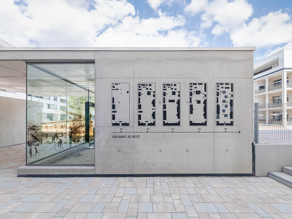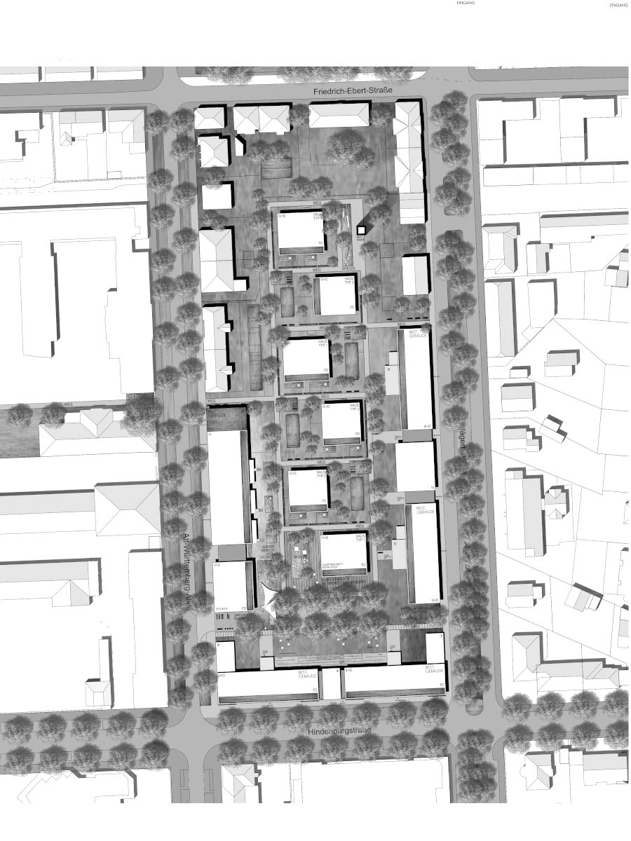 Konversion der ehemaligen Jägerhofkaserne zu einem neuen Stadtquartier mit 161 Wohneinheiten in unterschiedlicher Größe, einer 4-gruppigen KITA, ca. 3.900m² Büro-, bzw. Gewerbeflächen und einer gemeinschaftlichen Tiefgarage. Ansatz einer Sichtbarwerdung und Visualisierung historischer baulicher Entwicklungen, Schichtungen und Texturen. Im geschichtlichen Kontext werden diese Phasen herausgearbeitet, weiterentwickelt und ergänzt. Historische Identität steht im Spanungsfeld von Bestandsstrukturen und Neubauten. Erlebbar geschichtliche Prozesse werden fortgeführt und mit der Neuordnung, Umstrukturierung von Alt und Neu zu einem Ganzen stimmig zusammengeführt.