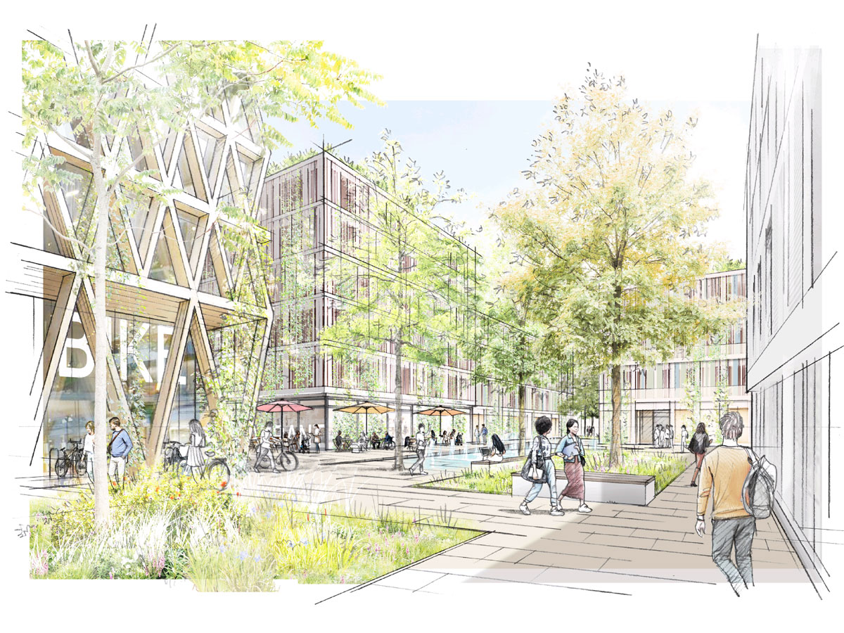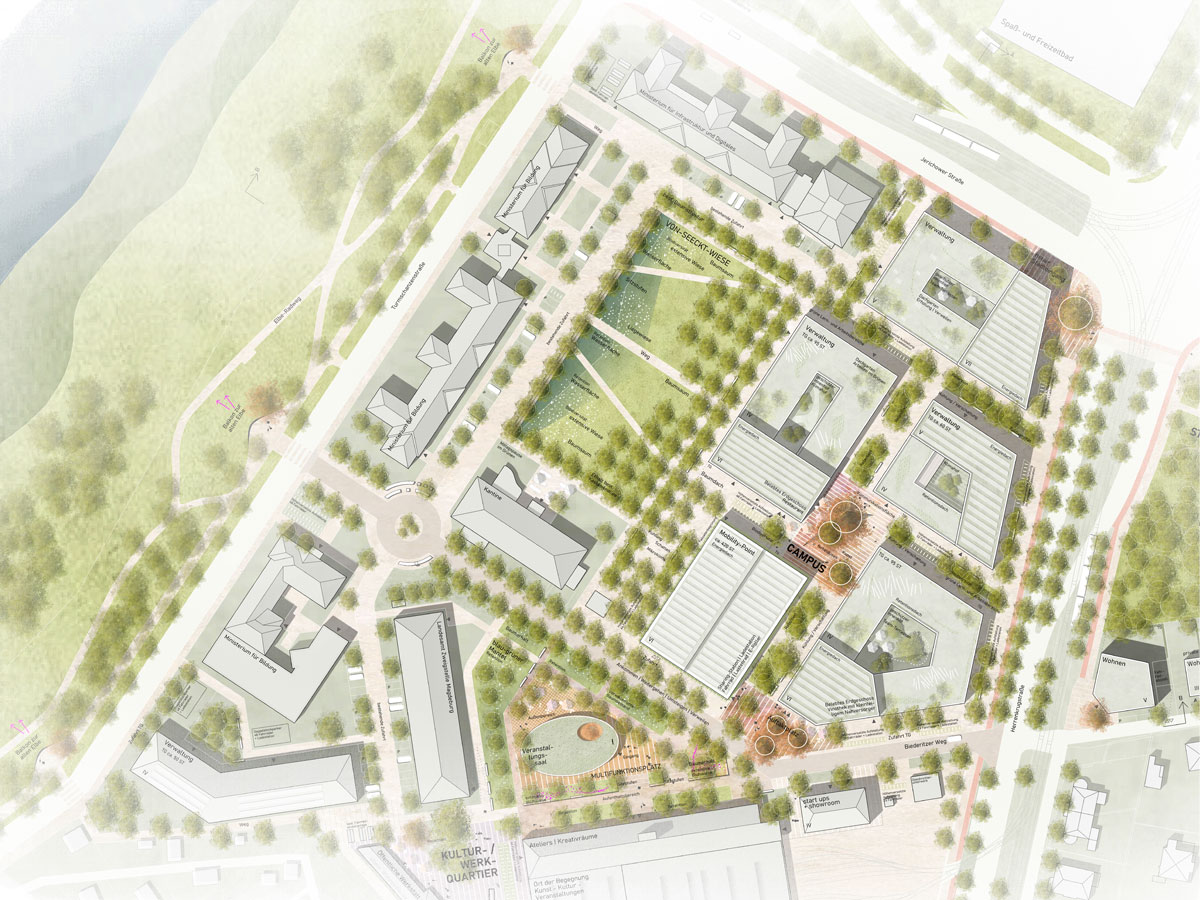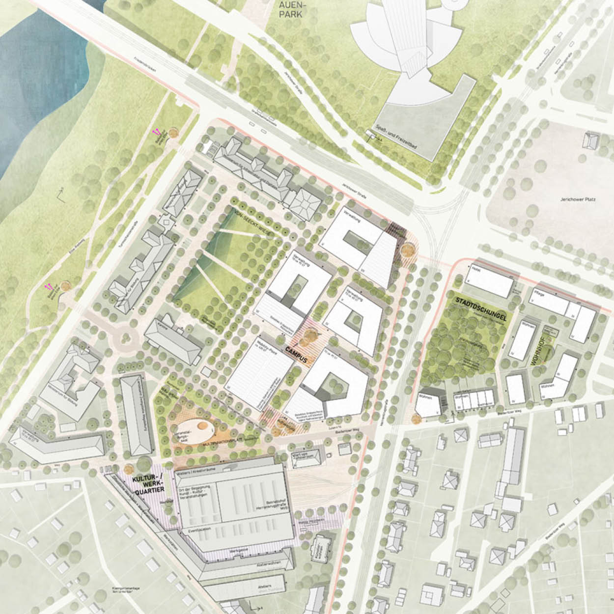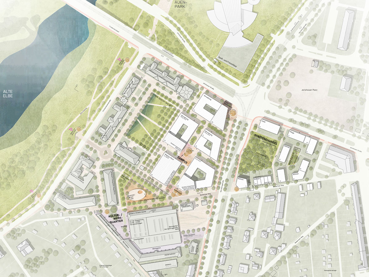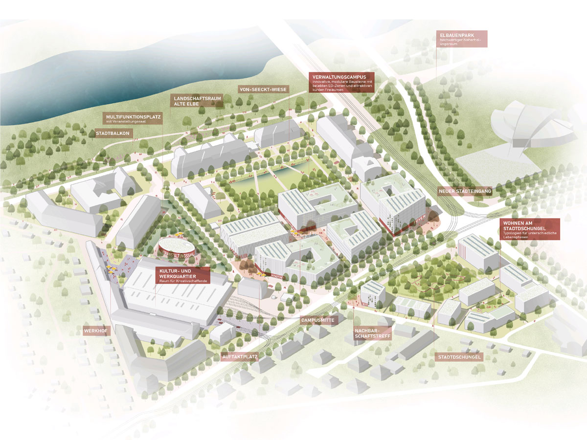 Angrenzend an diesen Campus entsteht ein modellhaftes und vielfältiges Quartier mit belebenden Kulturangeboten und Wohnnutzung. Über neue, öffentliche Wegeverbindungen entstehen naturräumliche Bezüge zur hochwertigen Auenlandschaft sowie zum Landesgartenschaugelände Elbauenpark. Eingebunden in den ortsprägenden besonderen Landschaftsraum entsteht aus Verbindung von erhaltenswertem Baumbestand und neu arrondierten Bausteinen ein Behördencampus mit Al-leinstellungsmerkmal entlang der Alten Elbe. Über neue, öffentliche Wegeverbindungen entstehen naturräumliche Bezüge zur hochwertigen Auenlandschaft sowie zum Landesgartenschaugelände Elbauenpark.